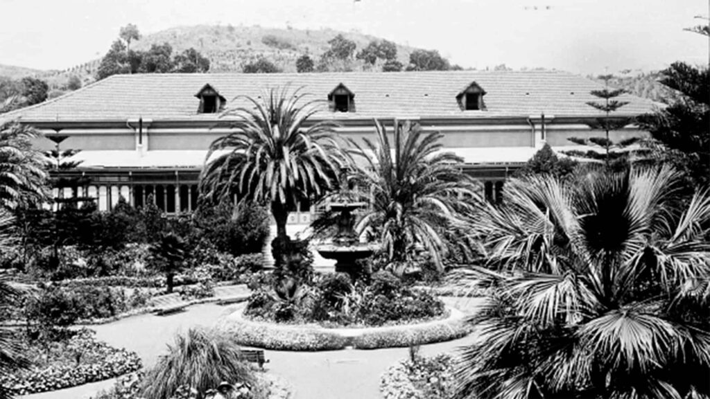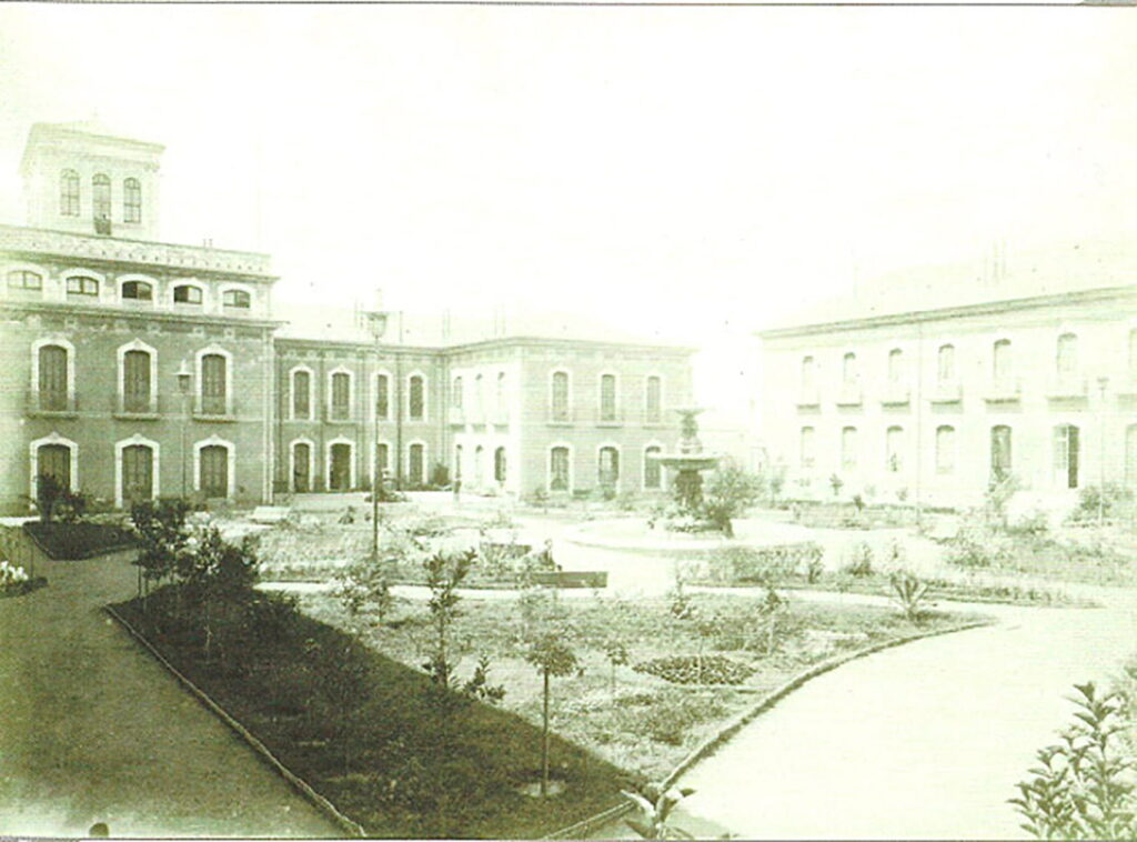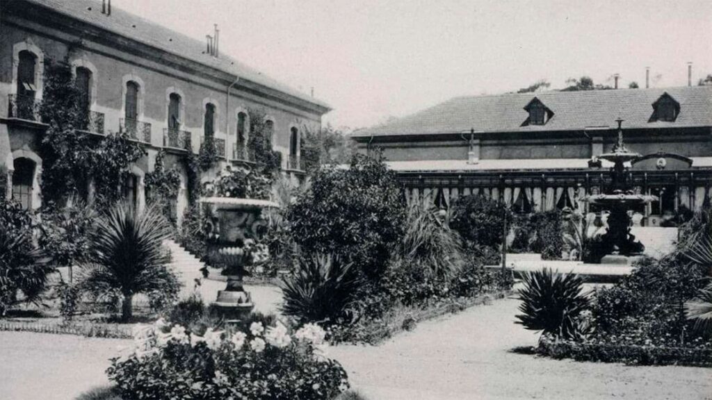 La configuración original del hotel se estructuraba en torno a un eje paisajístico fundamental. La documentación histórica describe un complejo de cuatro pabellones que rodeaban un jardín central. Este espacio verde actuaba como el verdadero corazón del programa arquitectónico, permitiendo la ventilación y la independencia de usos.