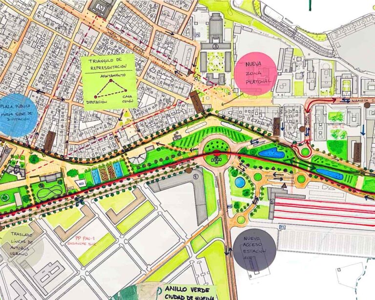 En AHAUS ARQUITECTOS, nuestra visión para este entorno es ambiciosa. A través de nuestra propuesta «Avenida Italia: Huelva Verde», proyectamos la creación de una gran plaza peatonal frente al recinto. El objetivo es eliminar la barrera del tráfico rodado para que el patrimonio «respire» y se funda con el espacio público.