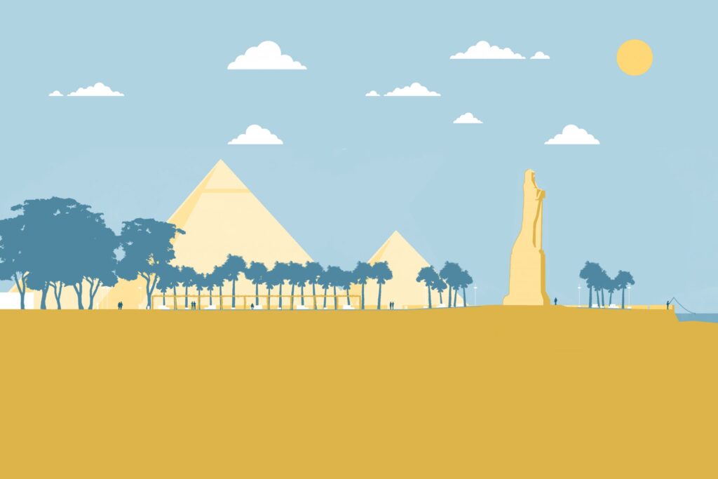 El resultado es único: un híbrido arquitectónico donde la monumentalidad y simbolismo egipcios dialogan con la narrativa del descubrimiento americano. Esta síntesis visual otorga al monumento una gravedad atemporal, como si la epopeya colombina mereciera la misma magnificencia que los faraones antiguos.