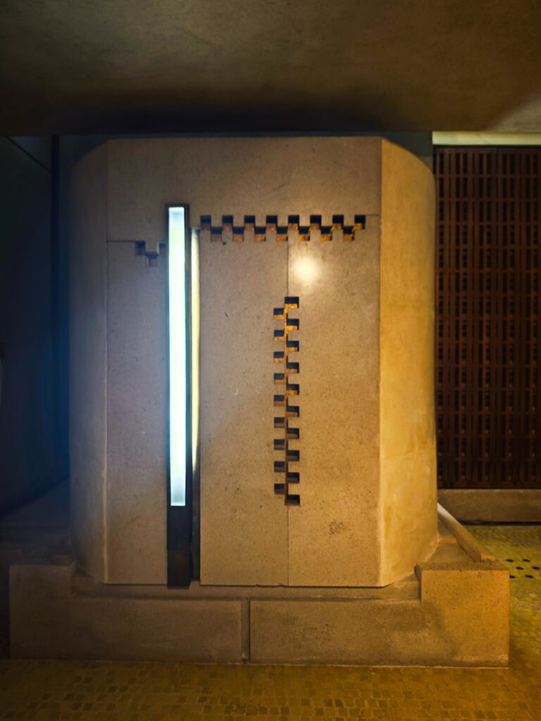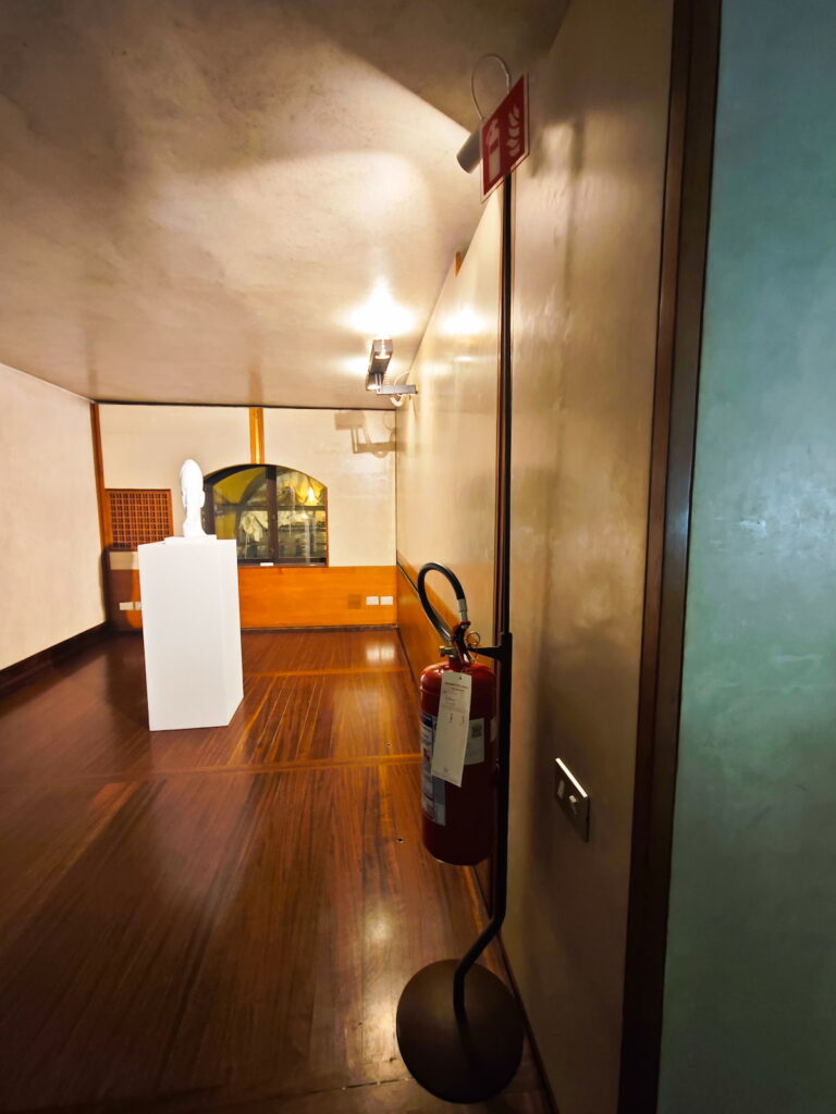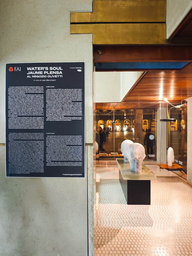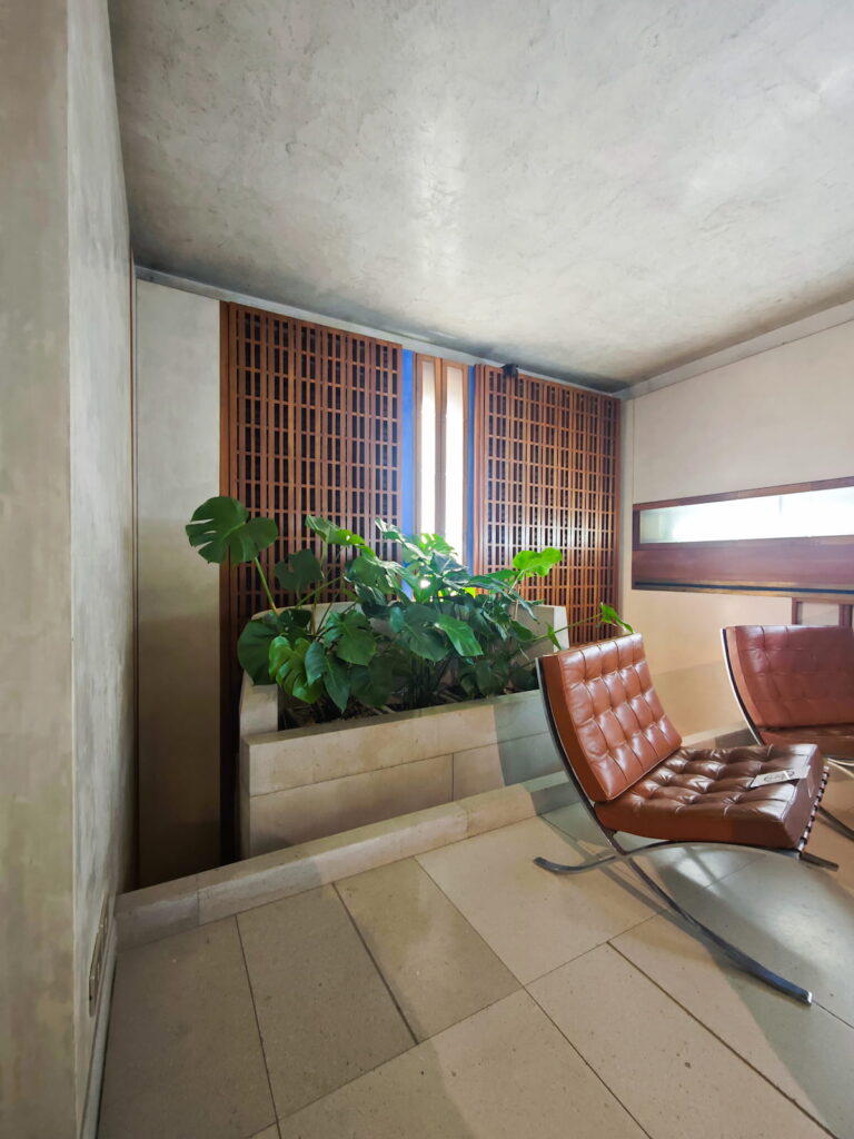Además, la entrada cuenta con una escultura de Alberto Viani («Nudo al sole») que descansa sobre una losa de mármol negro bañada por una fina lámina de agua real. Es un guiño a la marea de Venecia, introduciendo la naturaleza dentro del entorno construido, un recurso que siempre aporta calma y bienestar.