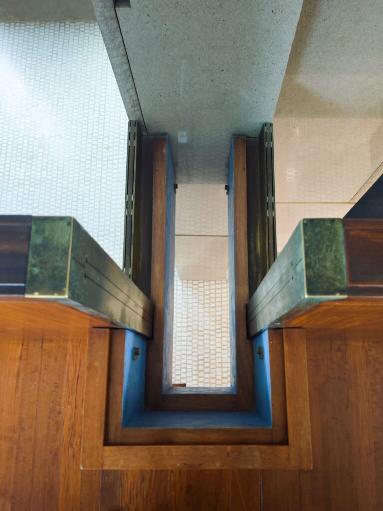 Si hay un elemento que define el proyecto y que todo amante del diseño debe conocer, es la escalera central. En un espacio tan reducido, una escalera convencional hubiera sido un muro visual. Scarpa, en cambio, diseñó una pieza que parece desafiar la gravedad.