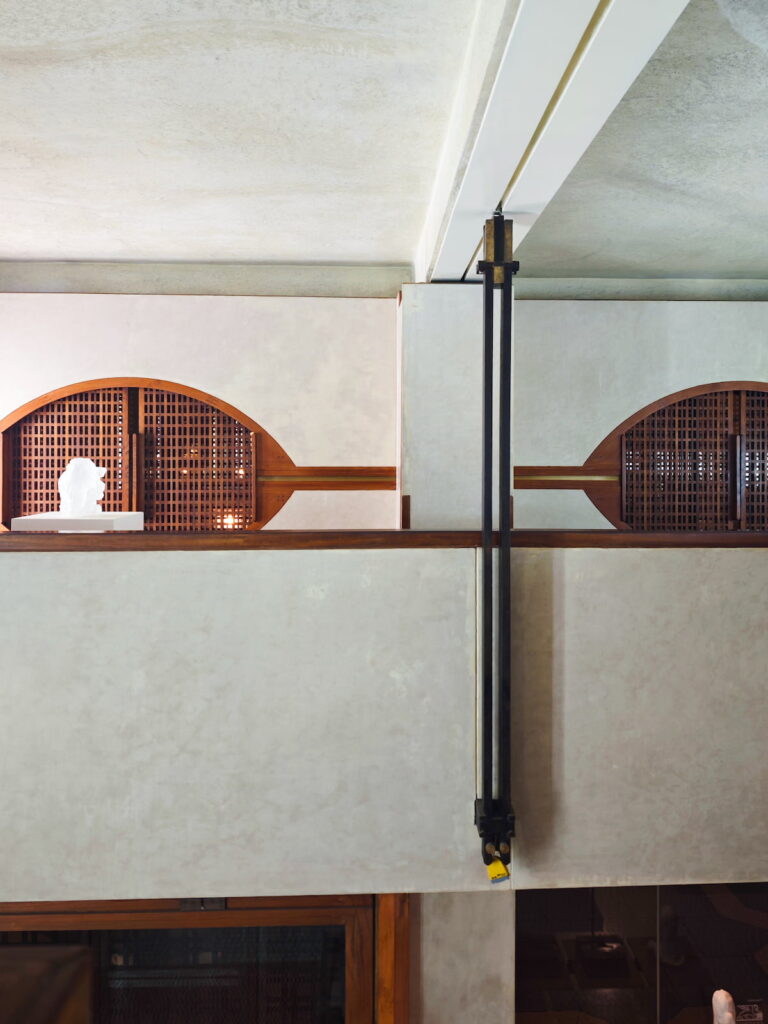 En la planta superior, sustituyó las carpinterías tradicionales por grandes ventanas de madera de teca con formas ovaladas, conocidas como «mandorlas». Estas no solo enmarcan las vistas hacia la plaza como si fueran cuadros, sino que actúan como un diafragma que controla la entrada de luz.
