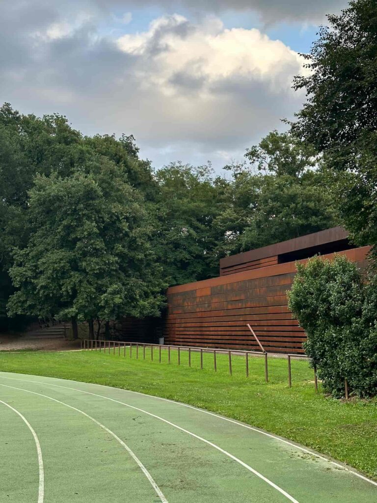 En este pabellón, el agua y la naturaleza son protagonistas. La arquitectura no solo responde a la función de acoger vestuarios o baños: crea un ambiente de calma, un lugar de pausa en medio del bosque.